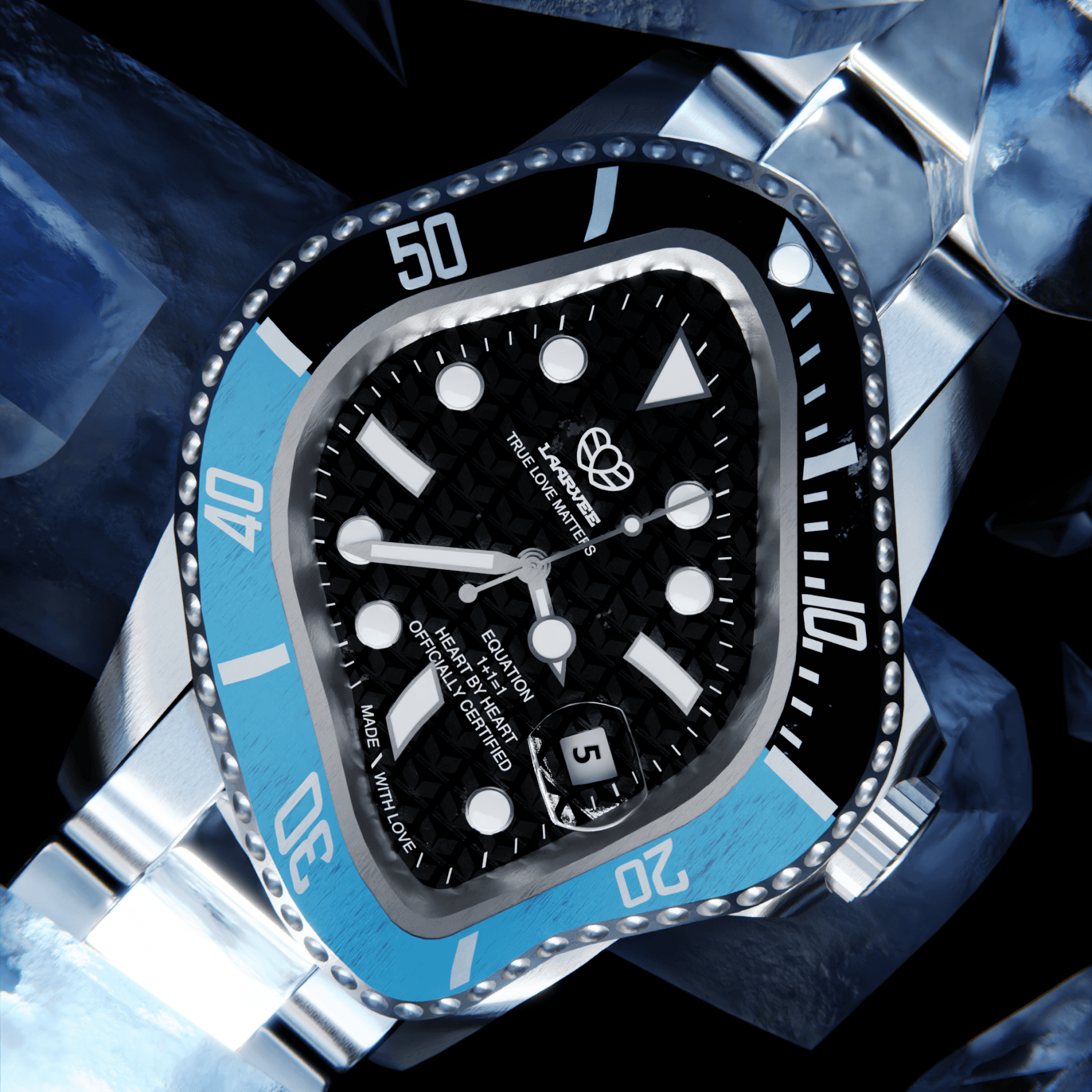 The client’s objective was to position the ‘ICE’ as a premium and experiential product, building on the success of previous collaborations while reinforcing exclusivity and craftsmanship. With its stainless steel construction, Japanese Miyota automatic movement, and distinctive black and blue bezel paired with a custom monogram dial, the watch required a creative direction that matched its technical sophistication.